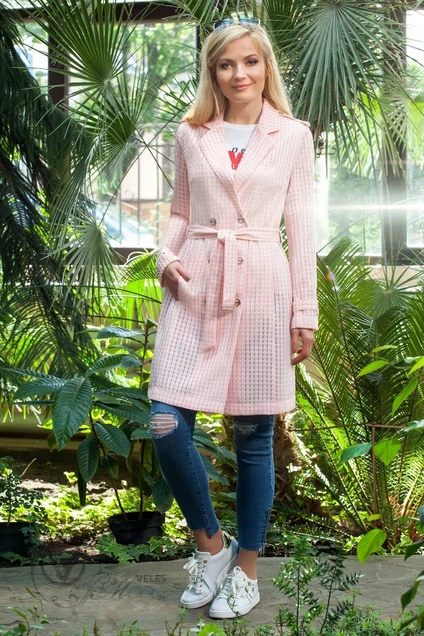 Ширина по линии груди: размер(44):0,48м, размер(46):0,50м, размер(48):0,52м, размер(50):0,54м. Ширина по лини бедер: размер(44):0,52м, размер(46):0,54м, размер(48):0,56м, размер(50):0,58м. Длина: 0,95 м, рукав 0,61 м. Тренч летний классический двубортный без подкладки, с отложным воротником, рукав втачной с патами по низу, по плечевым швам погоны, по переду изделия карманы. Трейч под съемный пояс с пряжкой.