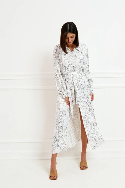 Характеристики: прямой свободный крой, воротник рубашечного типа, рукав втчаной по низу рукава манжета на пуговичке, застежка центральная на петли пуговицы до середины изделия, по линии талии нашиты шлевки, в комплекте пояс выполнен из ткани основного изделия. По переду крупные карманы, в боковых швах разрезы 73 см.