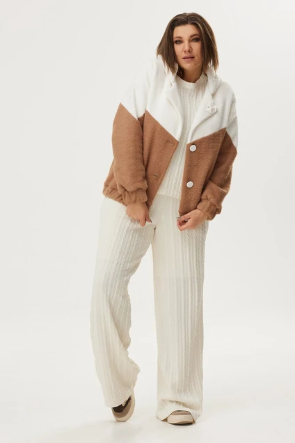 Прекрасный бомбер, который согреет Вас в прохладную погоду. Выполнен из сочетания мягких, трикотажных тканей с натуральным составом. Используется два вида тканей: двухсторонний трикотаж с мягким ворсом + мягкий трикотаж со стриженным ворсом в стиле Ангоры. Фигурный крой и разрезные детали контрастной расцветки, грамотно прорисовывают нужные линии, что позволяет визуально подчеркнуть достоинства фигуры.