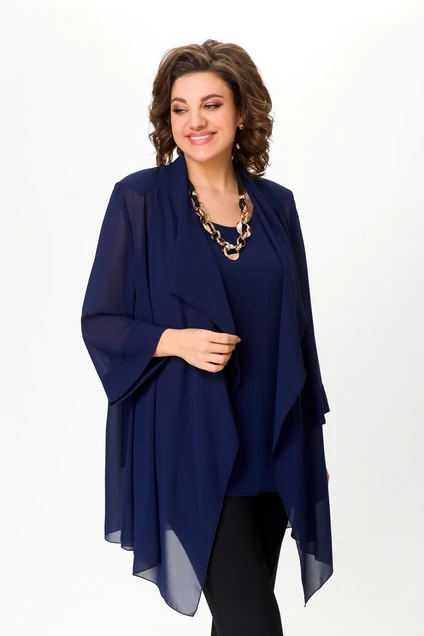 Элегантный комплект из топа и кардигана выполнен в спокойных темно-синих тонах. Топ имеет длину 69 см и простой крой, отлично сочетается с любым видом низа. Кардиган длиной 86 см отличается оригинальным асимметричным покроем с плавными, волнующими краями, добавляющими образу легкости и изысканности. Такой комплект идеально подходит как для деловых мероприятий, так и для вечерних выходов.