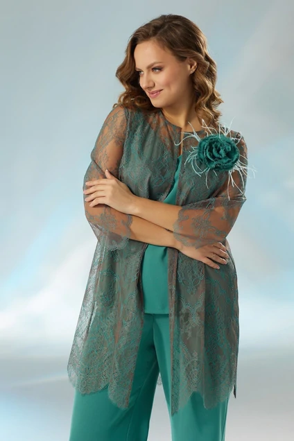 Стильный кардиган из изящного, воздушного, итальянского кружева придаст особенной женственности и хрупкости образу. Кардиган удлиненный, прямого силуэта, с круглым вырезом горловины, нагрудными вытачками и втачным рукавом длиной ¾. Комплектуя с брюками и топом из нашей коллекции, можно создать прекрасный комплект для торжественных случаев. В комплект входит дизайнерская брошь-цветок ручной работы. Длина кардинага 87.6 см. Параметры модели: рост 170, 50 размер.