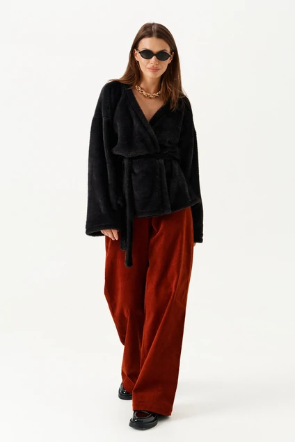 Элегантный тёмно-серый кардиган из мягкого трикотажного полотна представляет собой идеальный выбор для создания стильного образа на каждый день. Эта модель прямого силуэта оснащена удобной подкладкой, что обеспечивает дополнительный комфорт. Горловина и борта изделия аккуратно обработаны цельнокроеной планкой, придавая кардигану дополнительную изысканность. Линия плеча спущенная, добавляя современный акцент в общий дизайн. Спинка изделия цельная, а рукава широкие и втачные, подчеркивающие свободный крой кардигана. В комплекте предусмотрен пояс из основной ткани, позволяющий акцентировать талию по желанию. Этот кардиган станет прекрасным дополнением к любому гардеробу, предлагая универсальность и стиль.