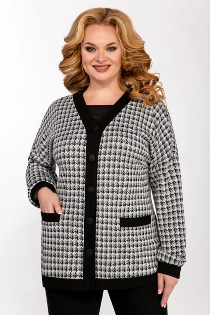 Кардиган женский прямого силуэта из уютного, приятного к телу трикотажного полотна. Застежка пр центру в виде планки на петли и пуговицы, спущенная линия плеча. Карманы прорезные с настрочными листочками. Рукав обработан притачной манжетой.