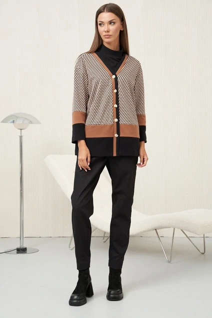 Свободный упрямлённый силуэт с заниженной линией плеча, рукав расширенный в области оката, центральная застёжка на отделочной планке. Полочка, спинка и рукав выполнены в технике "колор-блок".