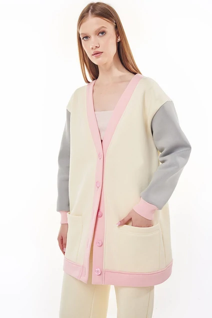 Современный кардиган мультиколор пошит из комфортной ткани (футера с начесом). Кардиган имеет прямой силуэт и длинные рукава с манжетами (из ткани кошкорсе). Вырез горловины Y-образной формы с притачной планкой. Застежка по центру переда на петли и пуговицы. На переде удобные карманы. По планкам, по карманам, проложена отделочная строчка.