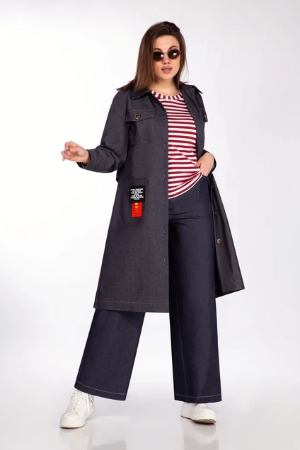 Джинсовый кардиган - актуальная, универсальная вещь, который сочетается практически со всеми предметами гардероба. Кардиган выполнен из джинсовой ткани средней плотности без подкладки, прямого силуэта, рубашечного покроя со спущенной линией плеча. Рубашечный воротник с отрезной стойкой. Центральная застежка на петли-пуговицы. Полочка с накладными карманами, верхние - с клапанами, на нижнем - декоративная нашивка. В верхней части спинки нашит декоративный элемент. Рукава втачные с манжетой с застежкой на петлю-пуговицу. В боковых швах разрезы. Модель дополнена съемным поясом. Длина рукава - 53,5см, ширина плеча - 21см, длина изделия - 107см.