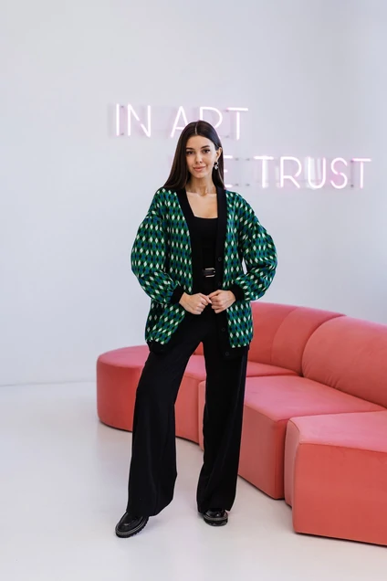 Кардиган женский трикотажный свободного прямого кроя в эффектные принты, застегивается на пуговицы, рукава длинные, вырез V-образный. Трикотажный кардиган – это практичная и универсальная вещь, которая незаменима в любое время года. У трикотажных кардиганов немало достоинств: они очень комфортны и удобны, хорошо согревают в прохладную погоду; изделия не подвержены деформации, они не мнутся, хорошо ложатся по фигуре, подчеркивая ее достоинства; практически не выгорают и даже после многочисленных стирок сохраняют стойкость цвета; качественный трикотаж экологически безопасен, не вызывает аллергических реакций, поэтому подходит людям-аллергикам; хорошо поглощают влагу и пропускают воздух, поэтому являются максимально гигиеничными. Модель умеренный оверсайз, к каждому размеру можно добавить на 1-2 размера больше, в зависимости как вы любите: очень свободно или умеренно.