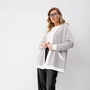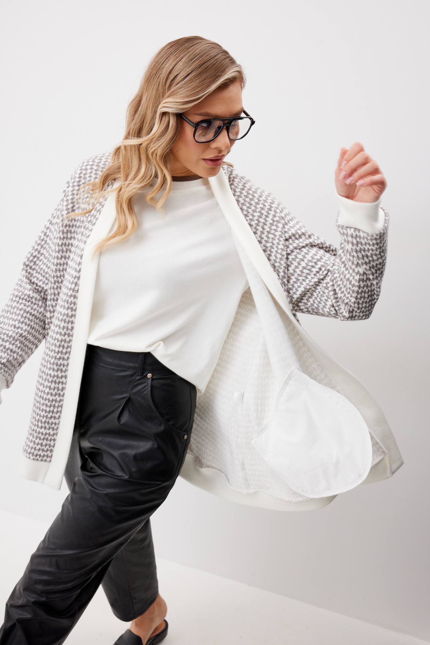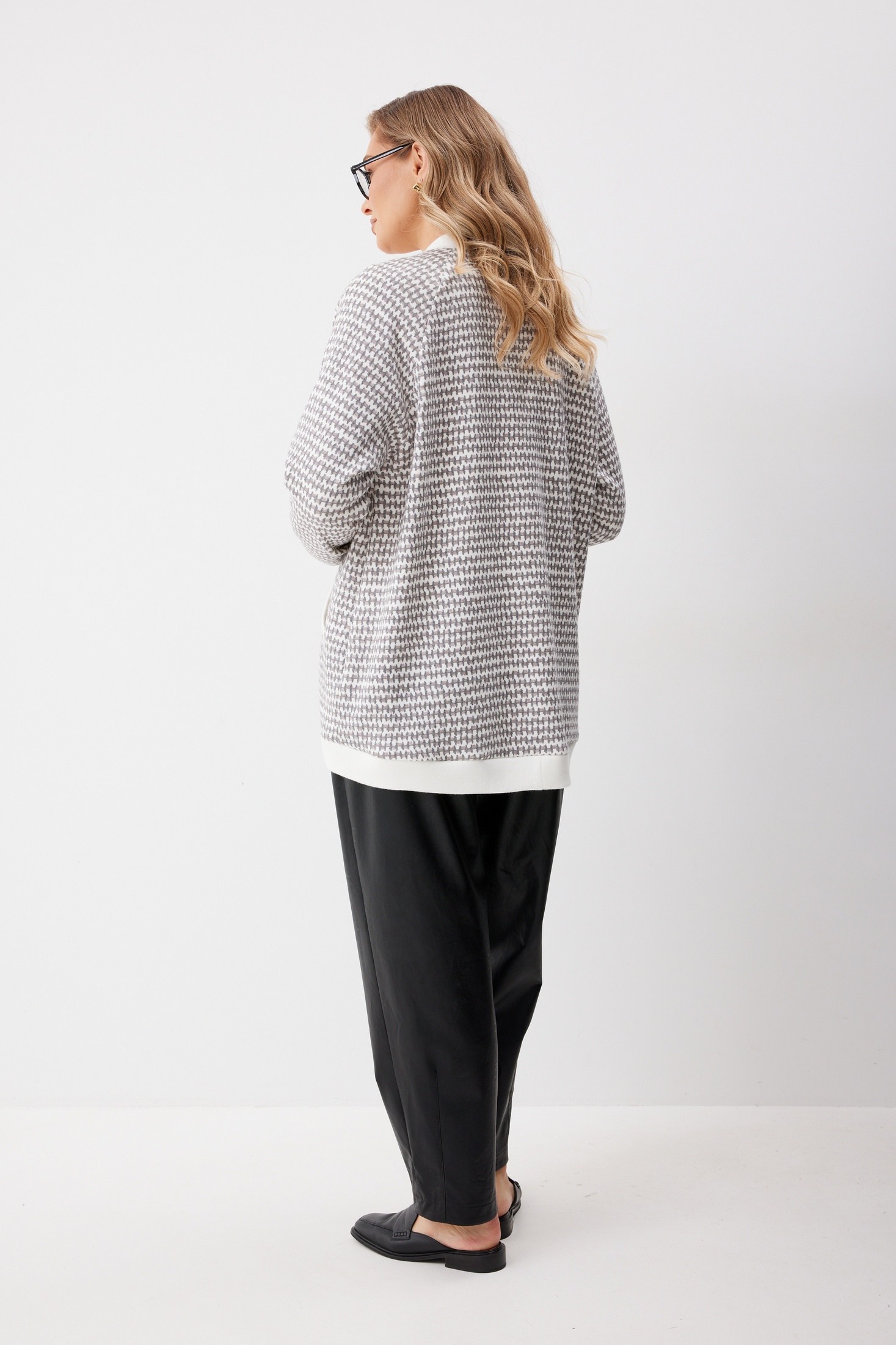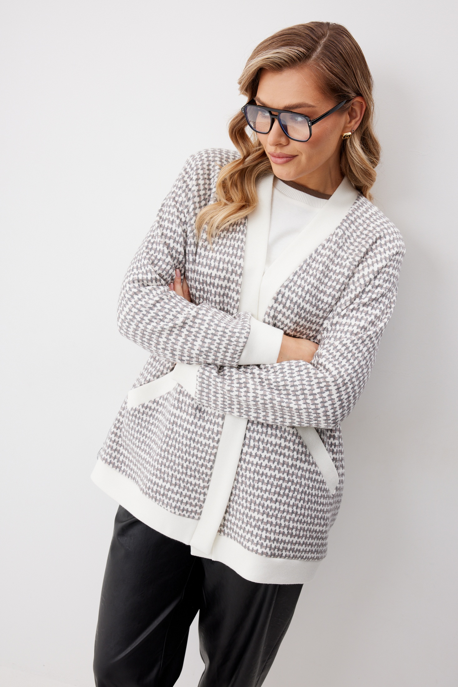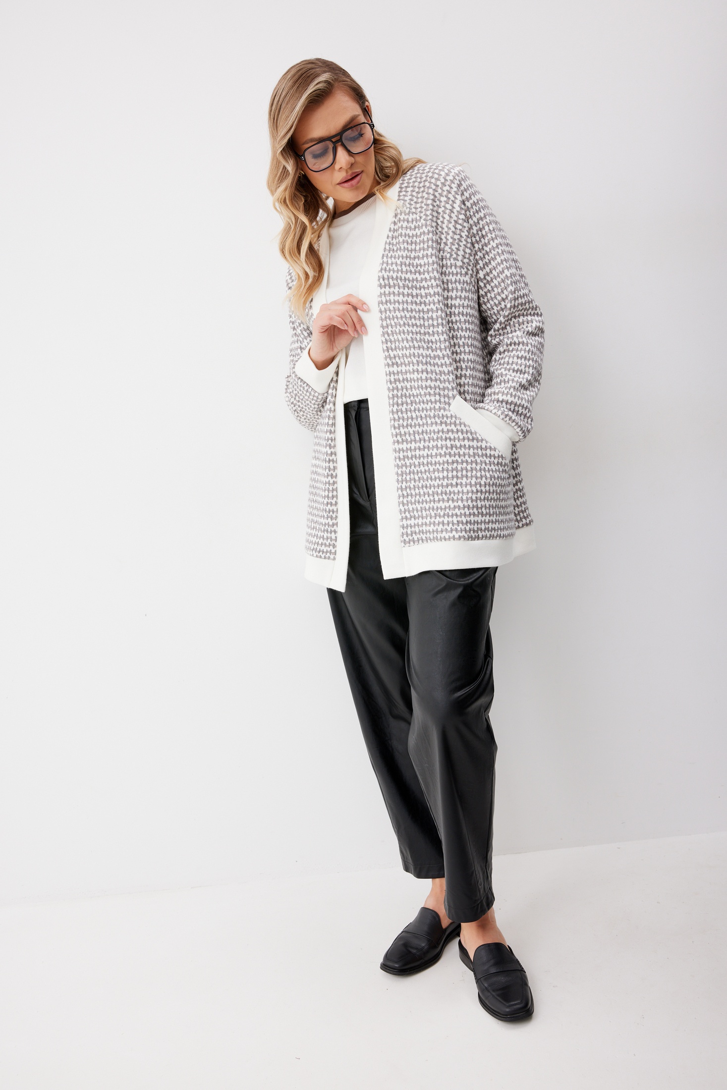 Кардиган женский прямого силуэта без подкладки из трикотажной ткани. По передним деталям кардигана располагаются прорезные карманы с листочкой из отделочной ткани. Спинка прямая. Рукав - реглан. По низу рукава пришита манжета из отделочной ткани. Линия борта, низа и горловины кардигана обработана притачными отделочными деталями.Длина спинки изделия 84,5 см, длина руква от горловины 80 см.