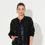 Жакет женский из нарядной ткани в пайетки. Жакет с длинным втачным рукавом. По низу рукава манжета на резинке. По переду имеются прорезные карманы в рамку. Горловина обработана стойкой. Застежка на молнию, вдоль которой отделочные планки. По низу жакета притачной пояс с резинкой. Планки вдоль молнии, манжеты, пояс по низу изделия оформлены деталями из атласной ткани. Жакет на вискозной подкладке. В этом нарядном жакете вы будете неотразимы!