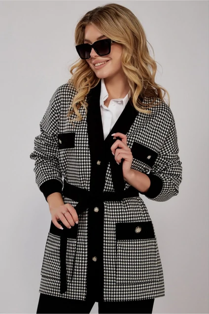 Кардиган женский из трикотажного полотна, прямого силуэта, длиной ниже линии бедер, со спущенной линией плеча, с втачными рукавами, в боковых швах обработаны разрезы, с застежкой на 3 петли и 3 пуговицы, со съемным поясом. Детали переда кардигана с притачными широкими планками, переходящие по горловине спинки; на уровне линии бедер расположены накладные карманы с застежкой на 1 петлю и пуговицу, вверху – широкие листочки с настрочными концами, на которых прикреплены декоративные пуговицы. Рукава втачные одношовные, с притачными манжетами. Декор может отличаться от представленного на фотографии. Длина спинки – 76см. Длина рукава - 49см, ширина рукава – 22см.