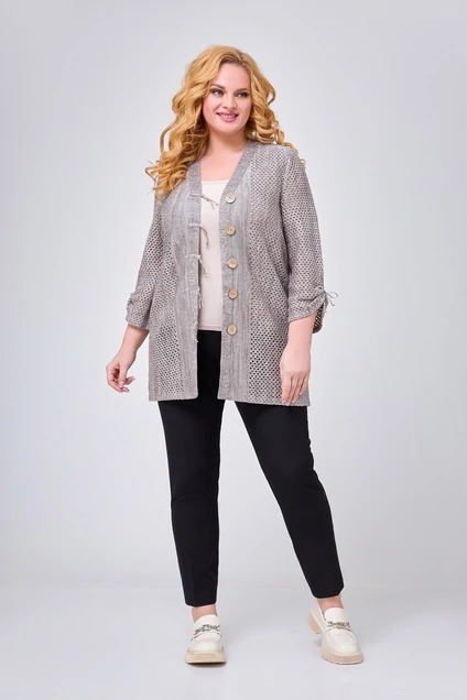 Кардиган связан меланжевой пряжей, с ажурными вставками. По рукавам декоративные завязки, что делает рукав чуть присобраным. Кардиган на пуговицах с навесными петлями. Длина изделия 76 см(±2), длина рукава ¾ - 47 см. Кардиган прямого силуэта с разрезами по бокам