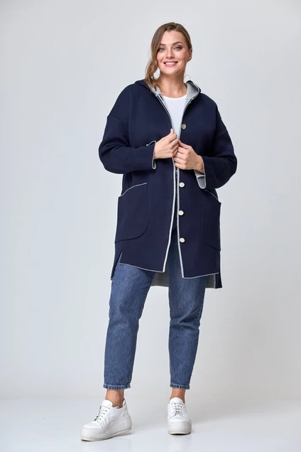 Кардиган прямого свободного силуэта с капюшоном. Рукав спущенный. По переду изделия декоративные рельефные швы, переходящие в маленькие разрезы. Низ кардигана по переду разной длины. Так же на полочках большие накладные карманы. Застежка – пуговицы.