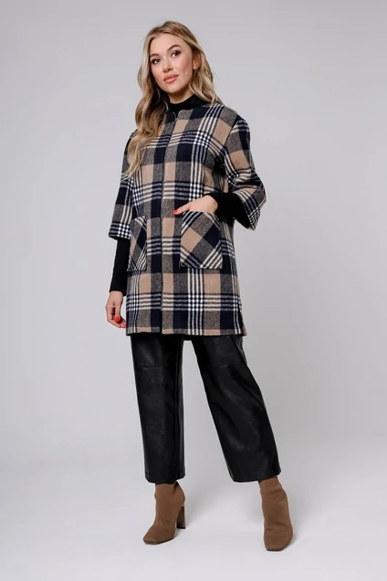 Кардиган из пальтовой ткани, прямого силуэта. Горловина округлой формы. Перед с нагрудными вытачками и центральной застежкой на молнию, в области бедер - накладные карманы с декоративным украшением. По низу в боковых швах обработаны разрезы. Рукав втачной укороченный, со слегка спущенным плечевым швом. Длина жакета: 82 см