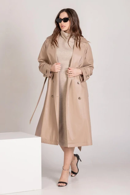 Кардиган женский двубортный, удлинённый, свободный, со спущенными плечами, слегка расклешённый к низу. Перёд с прорезными карманами и клапанами, застёжкой на три прорезные петли и пуговицы. Центральный шов спинки заканчивается шлицей с разрезом. Воротник отложной с лацканами пиджачного типа. Рукава одно шовные втачные с патами по низу.