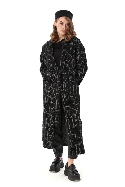 Элегантный длинный кардиган свободного прямого силуэта — идеальный выбор для создания стильного и утонченного образа. Изделие выполнено в черном цвете с контрастным геометрическим принтом, добавляющим изысканности. Кардиган оснащен удобными накладными карманами и поясом, позволяющим акцентировать талию. Модель с двухшовными втачными рукавами и приспущенной проймой подчеркивает расслабленный стиль. Английский воротник придает законченный вид, а отсутствие застежки усиливает непринужденность модели. Добавленные боковые разрезы обеспечивают свободу движений, делая этот кардиган не только стильным, но и комфортным выбором на каждый день.