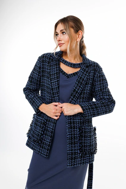 Уютный кардиган свободного прямого силуэта длиной ниже линии бедер из приятной твидовой ткани в стиле "шанель". Изделие со съемным поясом на подкладке и накладными карманами с бахромой. Рукав втачной, двухшовный, пройма спущена на 3 см. Воротник английский. Застежка не предусмотрена.