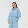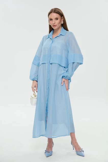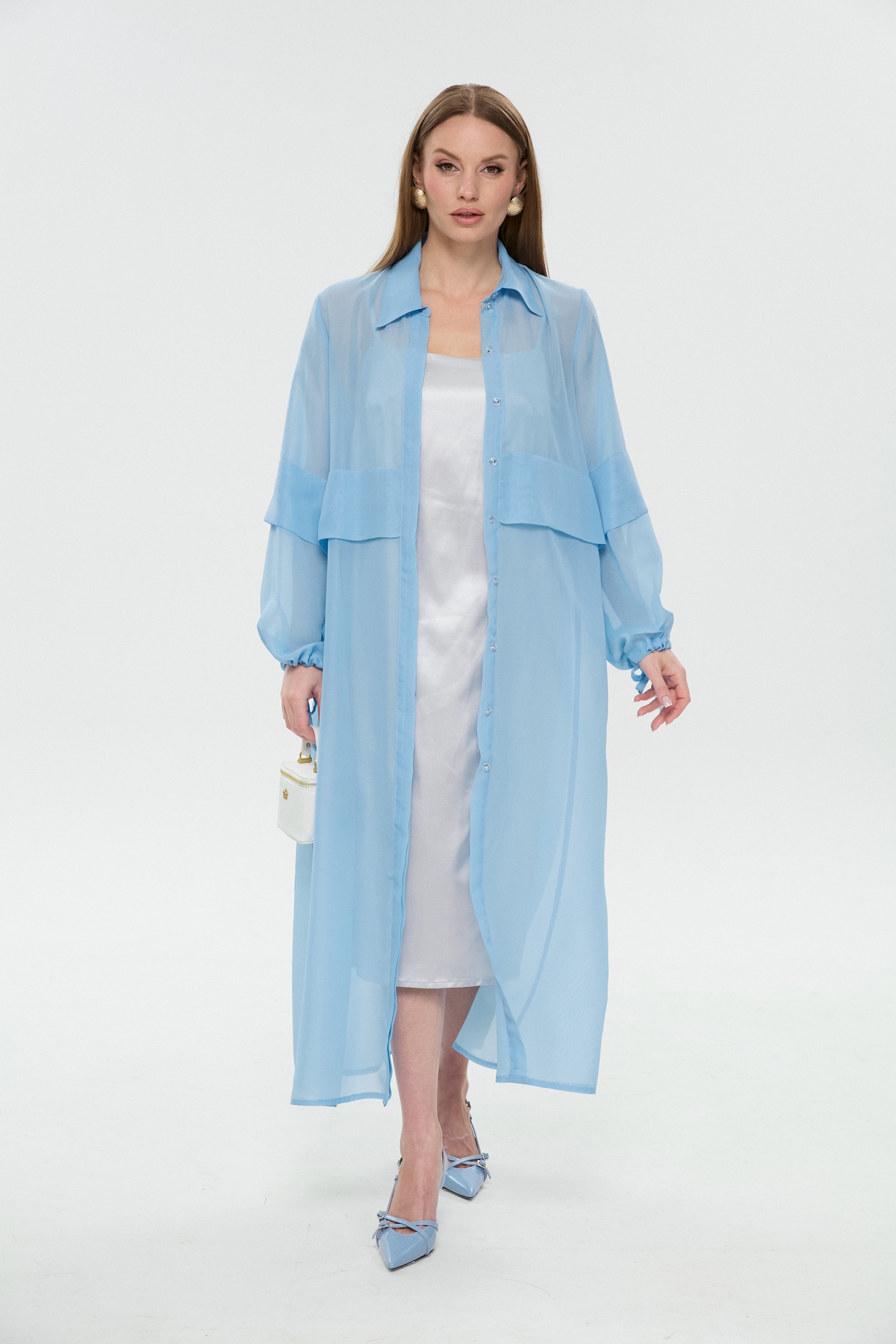 Платье-кардиган из шифона с центральной отрезной застёжкой на потайную планку на петли и пуговицы.По переду и спинке цельнокроеные складки на уровне талии. Рукав втачной,одношовный рубашечноно типа. По низу рукава пробиты петли и вставлена завязка для фиксации сборки . Воротник рубашечный стояче отложной.