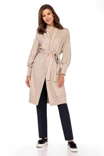 Кардиган женский, прямого силуэта, длиной выше линии коленей, с втачными рукавами, в боковых швах обработаны разрезы, со съемным поясом. Детали переда кардигана с притачными широкими планками, переходящие по горловине спинки; на уровне линии бедер расположены накладные карманы. Рукава втачные одношовные широкие, с притачными манжетами, по окату рукавов - сборка. Длина изделия Длина спинки – 87см.