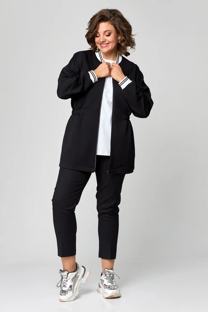 Удобный удлинённый кардиган , выполнен из трикотажного полотна. Линия плеча мягкая, рукав спущенный. На манжете и по горловине декоративные довязы. Застежка на тесьму- молнию. Приталеность силуэта достигается за счет резинки. В боковых швах разрезы.