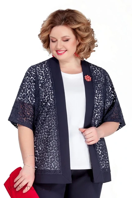 Комплект-двойка, состоящий из накидки и майки. Накидка прямого силуэта без застежки и воротника. Выполнена из кружевного хлопкового полотна с отделкой из однотона. Рукав цельнокроенный. Край борта и низ изделия оформлен узкой притачной деталью. Длина спинки 75 см. длина рукава 35 см. Майка прямого силуэта из трикотажной вискозы. Вырез горловины округлый. Рукав втачной одношовный. Длина спинки 65 см. Длина рукава 23 см.