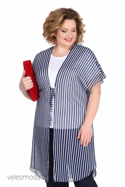 Комплект-двойка: шазюбль и майка. Шазюбль прямого силуэта, выполнен из шифона. По переду на тонкой завязке в области линии талии. Рукав укороченный цельнокроенный. Длина спинки 98 см. Майка прямого силуэта из трикотажной вискозы. Вырез горловины округлый. Рукав втачной одношовный. Длина спинки 65 см. Длина рукава 23 см.