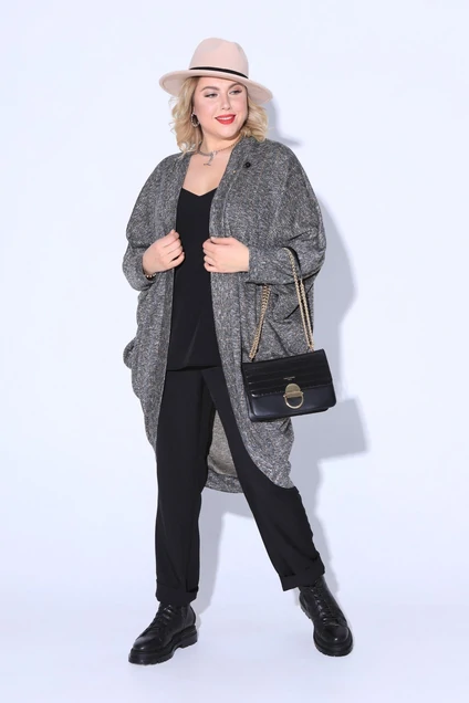 Трикотажный кардиган без застёжки, с цельновыкроенными рукавами. Борта, горловина и низ рукавов обработаны планками.