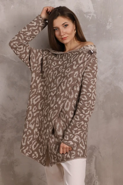 Кардиган с переплетением жаккард (леопард). Трапециевидный силуэт. Застежка на запах на одну петлю и пуговицу. Длина жакета -78см, длина рукава - 58 см.