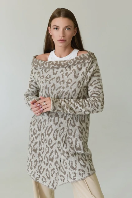 Кардиган с переплетением жаккард (леопард). Трапециевидный силуэт. Застежка на запах на одну петлю и пуговицу. Длина жакета -78см, длина рукава - 58 см.
