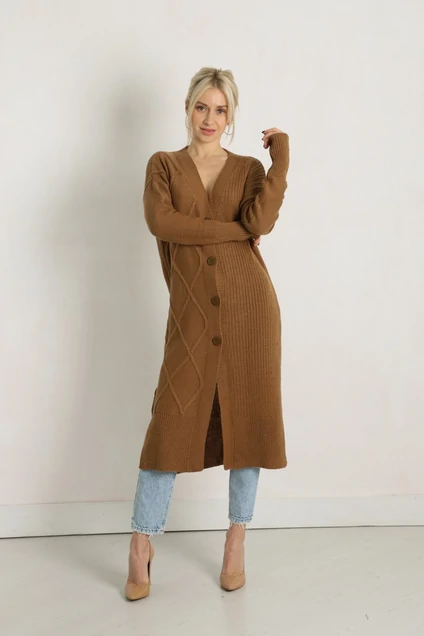 Длинный, мягкий, уютный кардиган прямого силуэта. Две полочки кардигана связаны разными узорами - этот акцент обязательно выделит тебя из толпы. Спинка и рукава кардигана связаны кулирной гладью. Кардиган застегивается на 4 пуговицы. Очень нежный элемент одежды для прохладной весны и осени! Дополни модный лук джинсами скинни, узкими брюками и маленькой сумочкой!