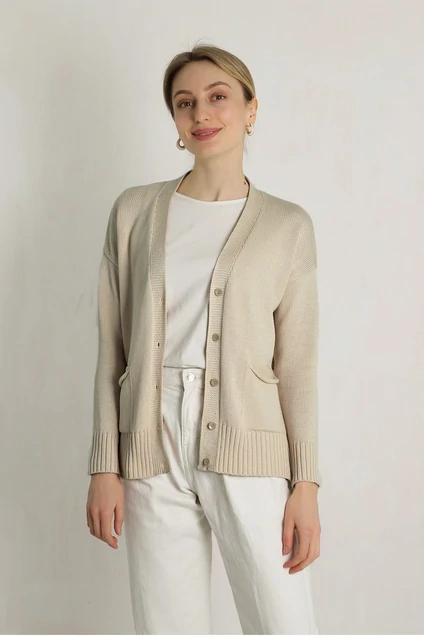 Жакет прямого силуэта связан из хлопковой пряжи. Застежка центральная на 5 пуговиц. Рукав рубашечный, длинный с заниженной линией плеча. По полочкам вывязанные карманы, перед и спинка разной длины. Разрезы по низу боковых швов украшают этот жакет. Низ изделия и низ рукавов вывязаны плотной резинкой. Дополняй любой образ все лето этим жакетом, носи поверх топов, маек или блузок, сочетай с брюками-бананами, белыми джинсами или кюлотами, а также с юбкой плиссе. Длина жакета-66см, длина рукава + плечо 67см.