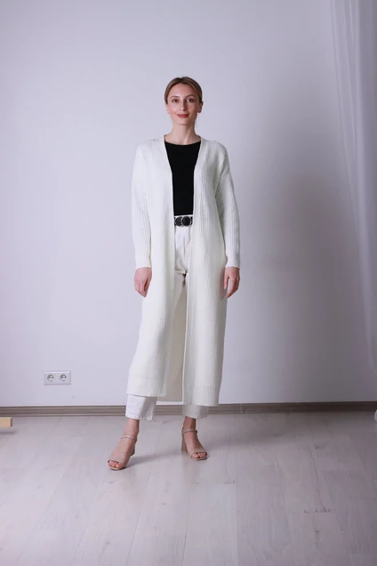 Длинный объёмный кардиган прямого силуэта. Рукав рубашечный длинный с заниженной линией плеча. Кардиган вывязан из мягкой пряжи переплетением «полу фанг». Сочетай кардиган с  джинсами, кожаными брюками или юбкой. Длина изделия 125см, длина рукава + плечо 68см