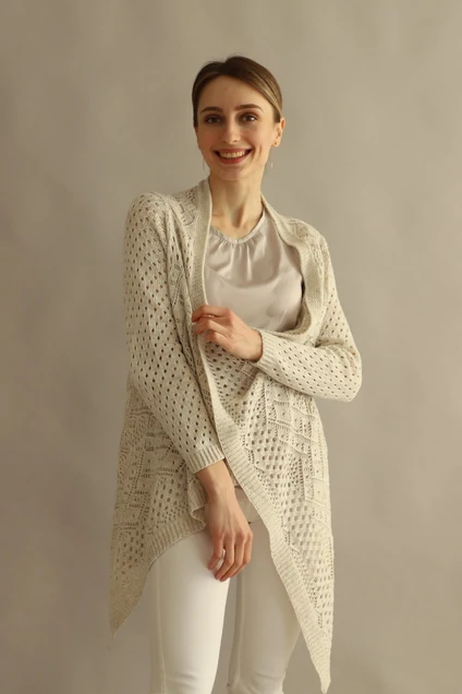 Базовый повседневный летний легкий кардиган без пуговиц, с запахом и ассимитричным передом. Свободный оверсайз крой изделия подойдет для любой фигуры. Ажурная вязка кардигана отлично сочетается со всеми предметами гардероба. Этот кардиган из хлопка отлично подходит, как для прогулок в прохладные летние дни, так и для офисной работы в любое время года. Носи с классическими брюками, брюками палаццо, костюмами, джинсами, юбками-плиссе и шортами. Идеально подходит для повседневной носки. Приятный к телу и легкий в уходе, после стирки - не линяет, не изменяет форму.