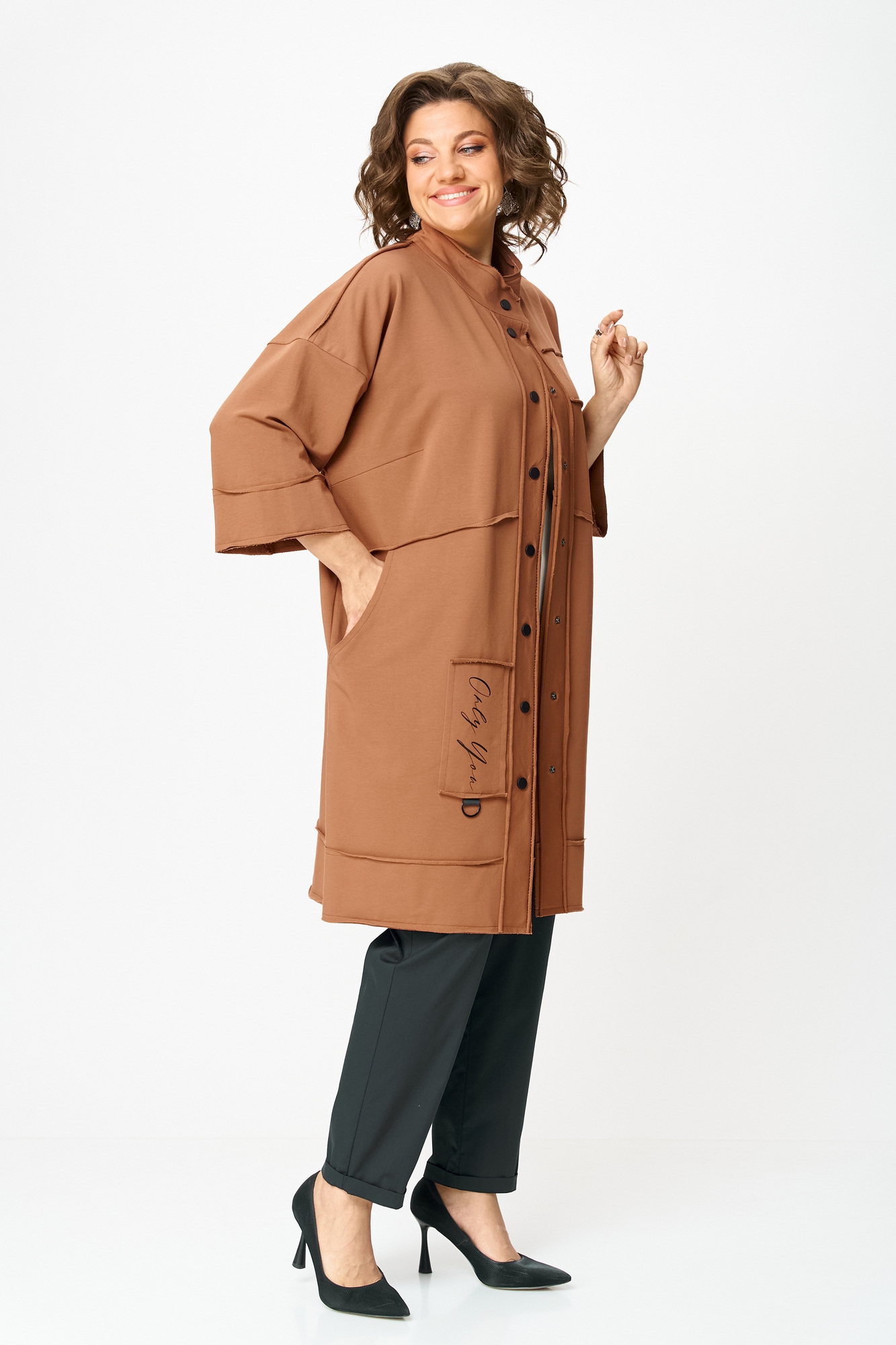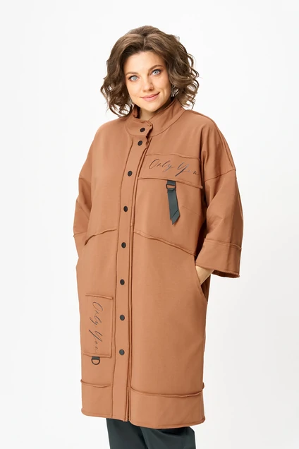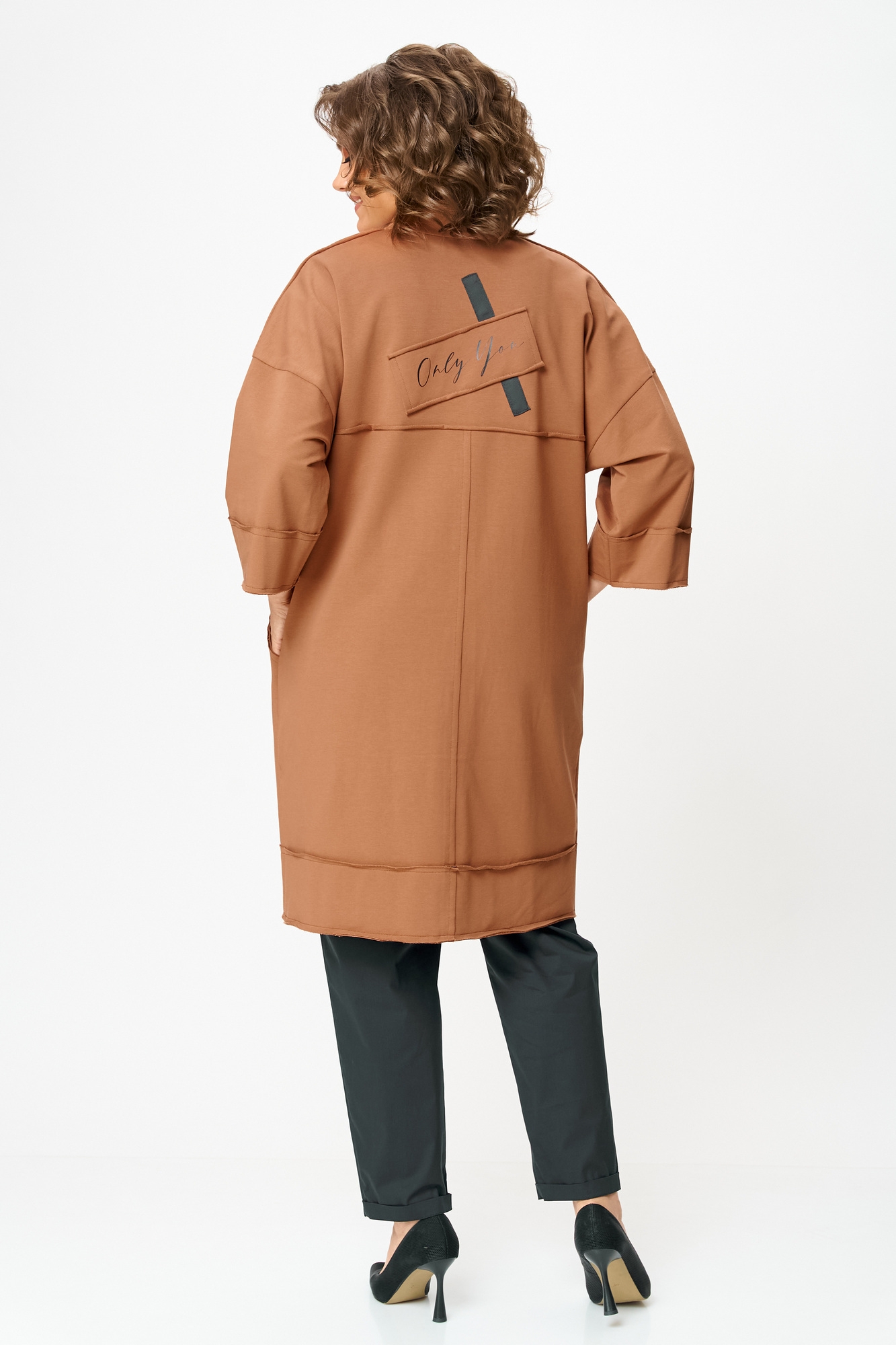 Кардиган женский  прямого силуэта из трикотажной ткани (двунитка-футер).  На полочке и спинке расположены декоративные, необработанные швы. В верхней и нижней части переда есть настрочные элементы с печатью и тесьмой. По переду изделия карманы. Спинка со средним швом и кокеткой. На кокетке расположен элемент с печатью и тесьмой. Рукав спущенный с манжетой. Вырез горловины оформлен стойкой. По переду изделия планка с кнопками. Длина изделия: 102 см ±1.0