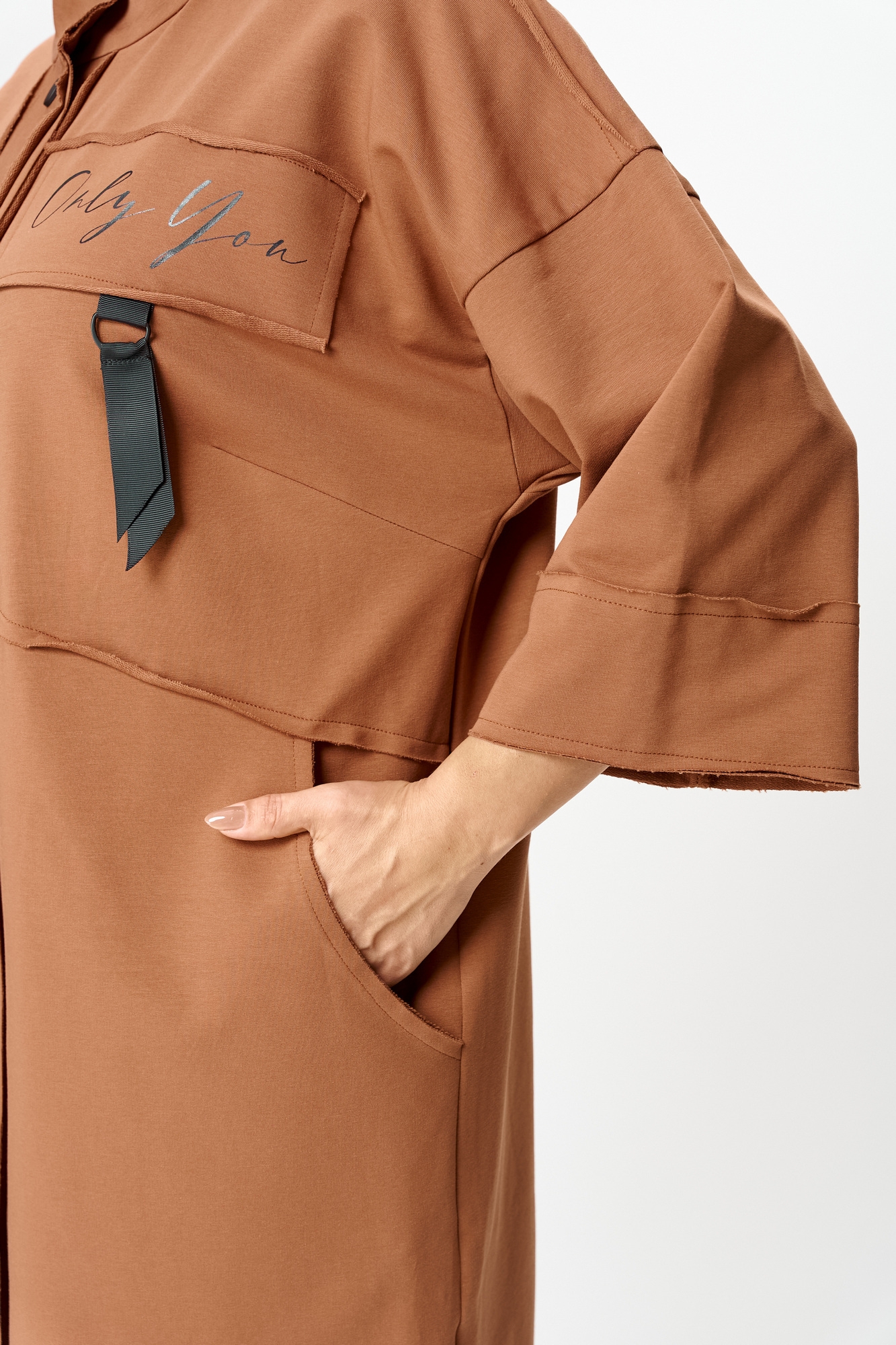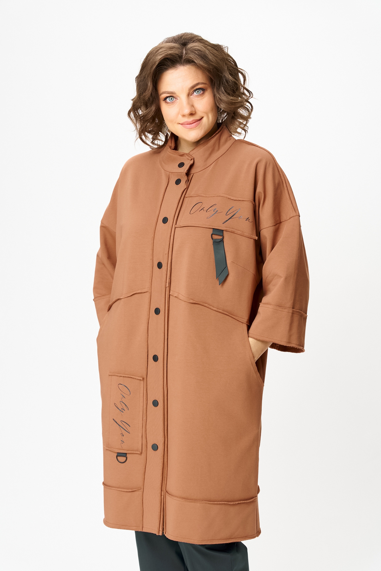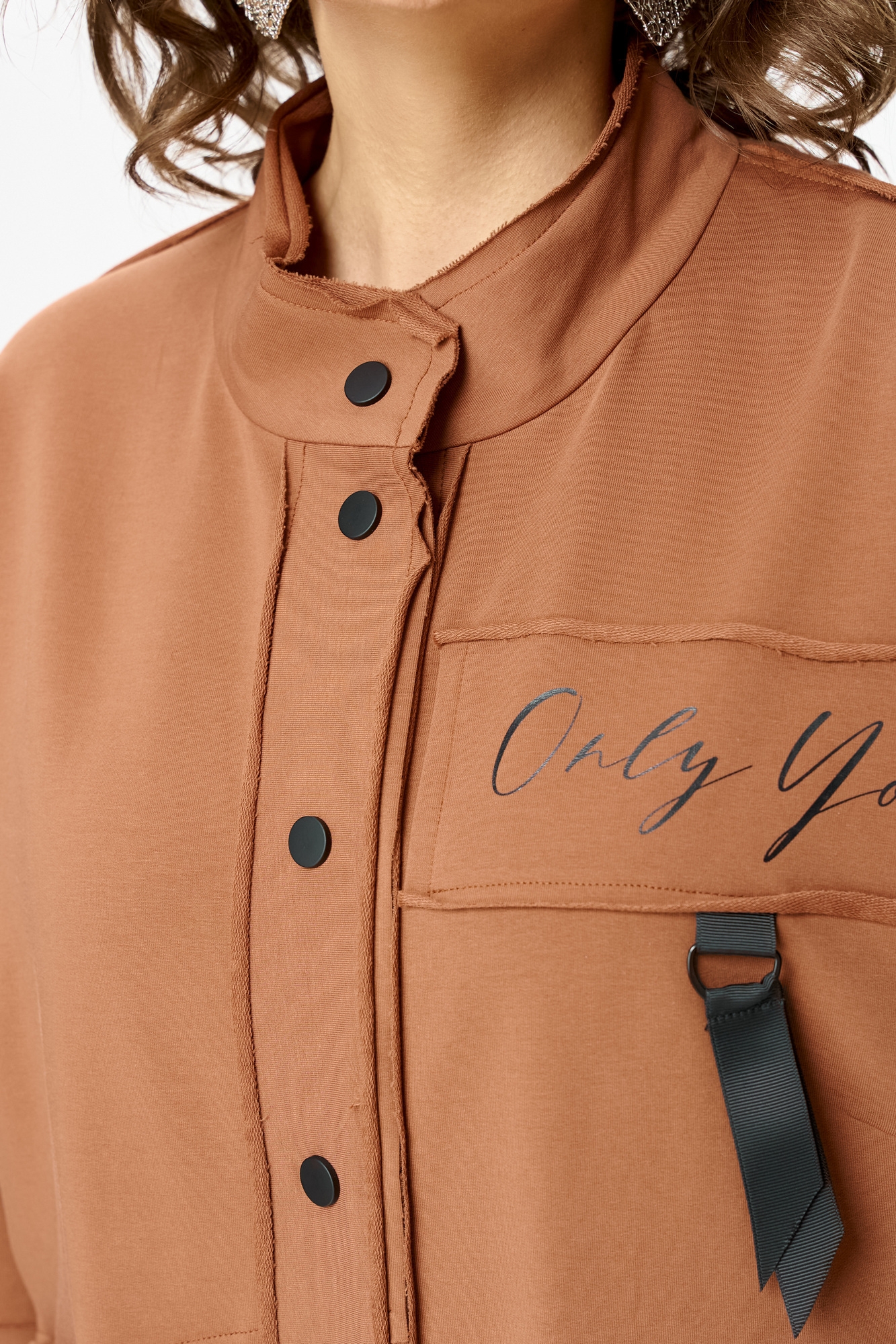 Кардиган женский  прямого силуэта из трикотажной ткани (двунитка-футер).  На полочке и спинке расположены декоративные, необработанные швы. В верхней и нижней части переда есть настрочные элементы с печатью и тесьмой. По переду изделия карманы. Спинка со средним швом и кокеткой. На кокетке расположен элемент с печатью и тесьмой. Рукав спущенный с манжетой. Вырез горловины оформлен стойкой. По переду изделия планка с кнопками. Длина изделия: 102 см ±1.0