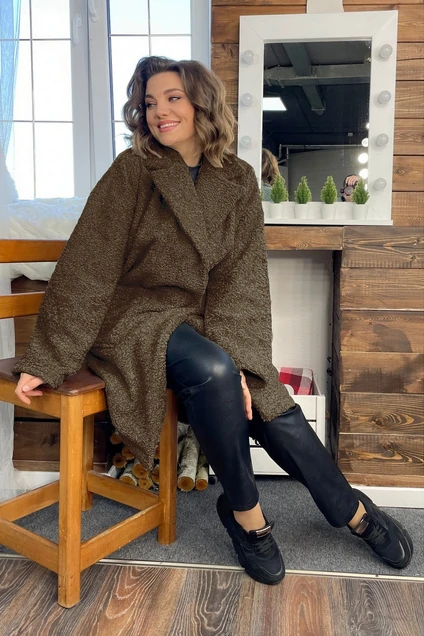 Кардиган женский двухбортный без подкладки из двухсторонней трикотажной ткани.Силуэт прямой ,слегка заужен к низу.По переду расположены нагрудные вытачки, накладные карманы. Рукав прямой,спущенный. Вырез горловины оформлен воротником и лацканом. Кардиган застегивается на кнопки. Внутренние швы не обработаны перед ноской,рекомендуем пройти роликом изнанку ( роликом для чистки одежды).Ткань в процессе носки не растягивается и не трескается под воздействием влаги и низкой температуры.длина по спинке -98 ±1 см.длина рукава от крайней точки у основания шеи - 80см