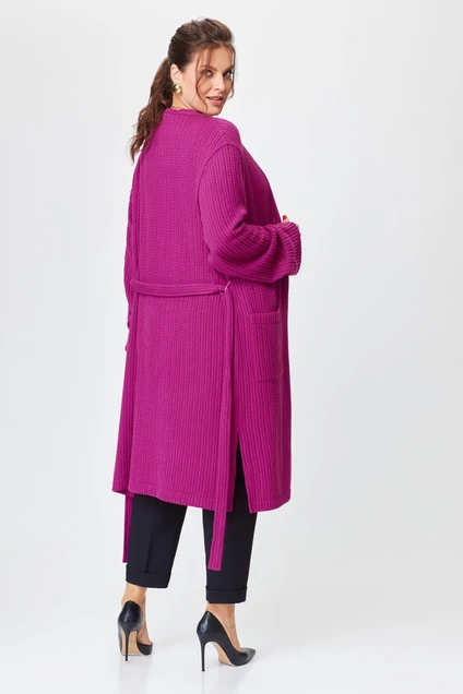 Кардиган женский «One Size» прямого силуэта, длиной ниже колена, из эластичной трикотажной ткани. Кардиган без подкладки со съемным поясом и накладными карманами. По переду и горловине спинки притачная планка, без застежки. Линия плеча слегка спущена. Рукав втачной длинный с отложной манжетой. В боковых швах разрезы. Украшен жакет съемным цветком из отделочной ткани.