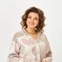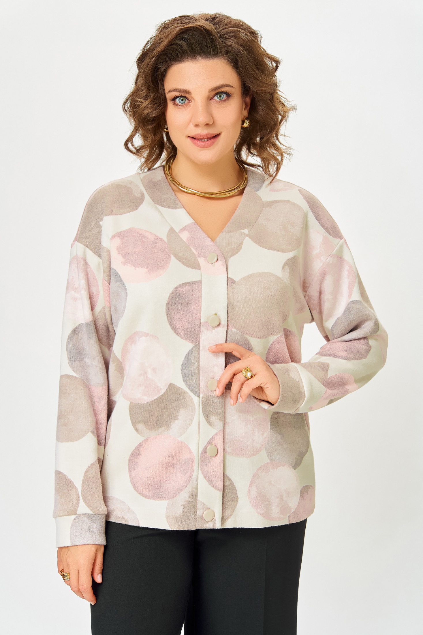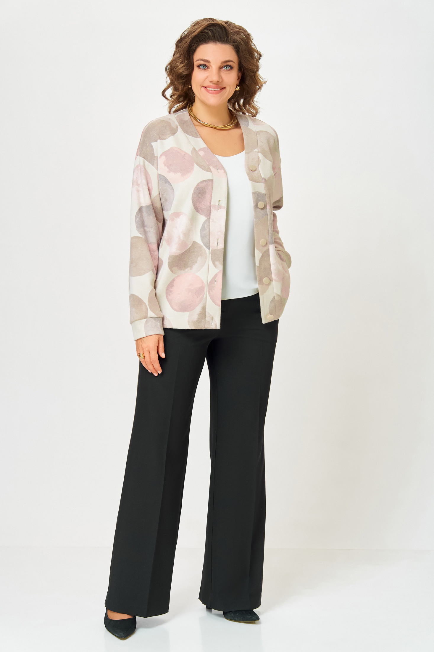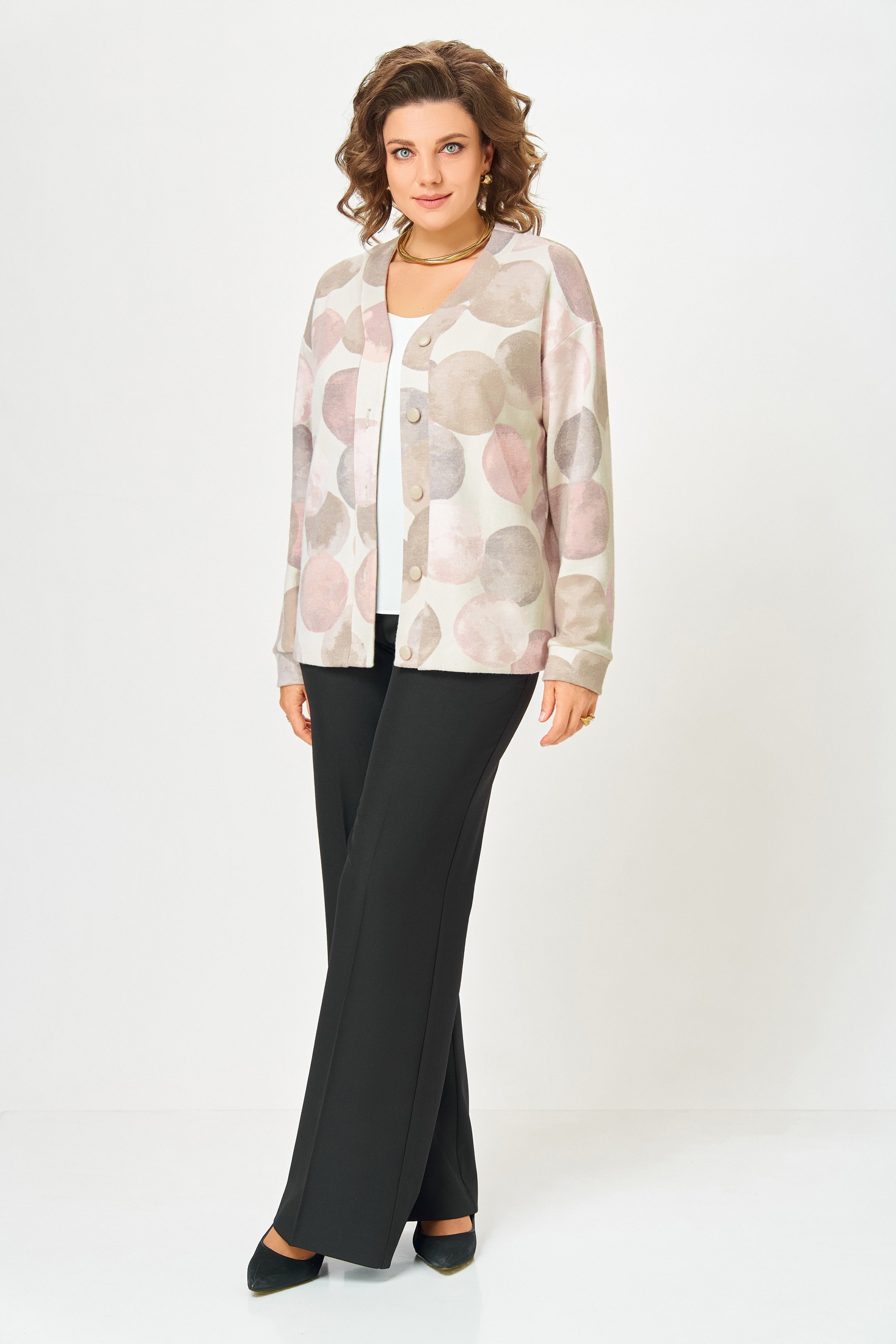 Кардиган из мягкого вискозного трикотажного полотна прямого силуэта со спущенной линией плеча и центральной застёжкой на петли и декоративные пуговицы. Горловина и борта обработаны фигурной планкой из основной ткани. Вырез горловины V-образной формы, рукав длинный, по низу с манжетой из основной ткани. Длина изделия по спинке – 65(+/-2) см. Длина рукава с манжетой от высшей плечевой точки - 75 см.