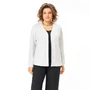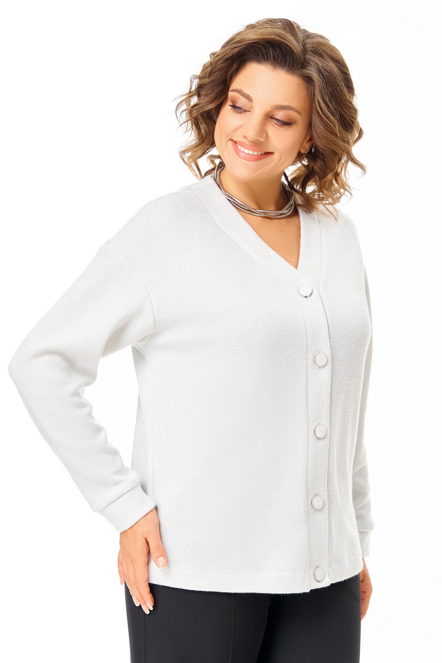 Кардиган из мягкого вискозного трикотажного полотна с серебристой люрексовой нитью, прямого силуэта со спущенной линией плеча и центральной застёжкой на петли и декоративные пуговицы. Горловина и борта обработаны фигурной планкой из основной ткани. Вырез горловины V-образной формы, рукав длинный, по низу с манжетой из основной ткани.