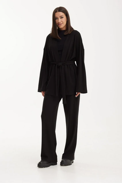 Кардиган свободного силуэта, выполнен из мягкого трикотажного полотна. Без застежки. Линия плеча спущена. Рукава втачные, длинные одношовные. В боковых швах разрезы. Спинка прямая. В комплекте пояс из аналогичной ткани. Длина по спинке 75 см.