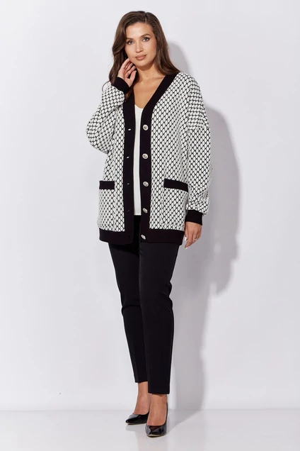 Кардиган женский, прямого силуэта, с длинным рукавом. Рукав рубашечный, со спущенной линией плеча. По низу рукава и низу кардигана отрезная манжета из эластичного трикотажно полотна (кашкарсе) Вырез горловины Y-образной формы. Застежка однобортная, с отрезной планкой(кашкарсе) на петли и пуговицы. По переду накладные карманы. Спинка без особенностей.