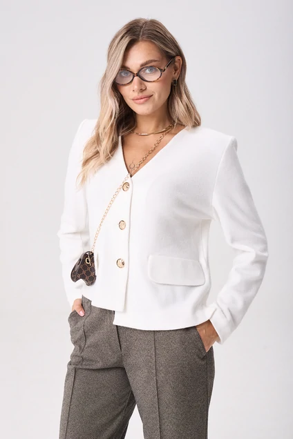 Кардиган прямого силуэта. Вырез горловины V-образной формы. Застежка на петли пуговицы. По переду изделия ассиметричная полочка. Втачной рукав, длинный. Кардиган без подкладки, с плечевыми накладками.