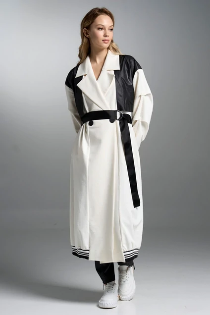 Кардиган свободного покроя со спущенной линией плеча.Застежка центральная двубортная на кнопки.Воротник отложной пиджачного типа.Спинка и полочки с отлетными кокетками из отделочной ткани.Рукав со складками в верхнем шве.Спинка со встречной складкой ниже уровня бедер.Карманы в боковых швах.Низ рукава и кардигана обработан отделочным довязом.Навесной пояс и боковые шлевки выполнены из репсовой тесьмы.В навесной пояс вставлены полукольца.
