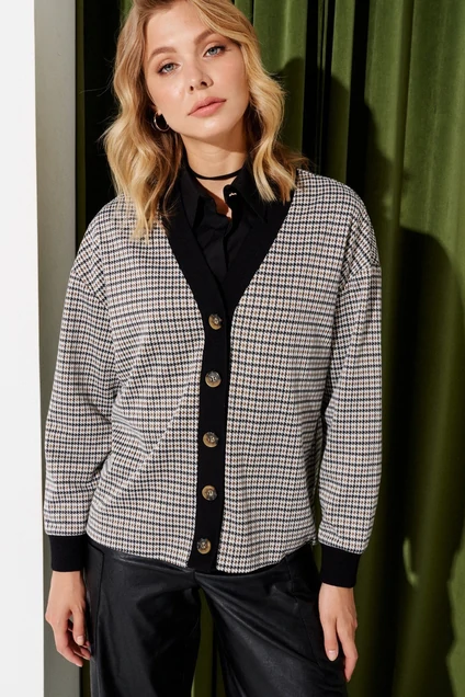 Кардиган женский. Выполнен из высококачественного трикотажа. Перед состоит из 2х частей с застежкой на притачную планку из кашкорсе, с V-образным вырезом. Рукав спущенный, втачной с притачной манжетой по низу. Низ изделия обработан на спецмашине. Длина по спинке 46р-59см , 54р-63 см.