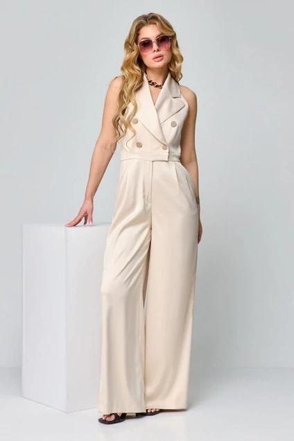 Комбинезон женский прямого силуэта с двубортной застежкой и воротником пиджачного типа, с широкими брюками и боковыми карманами.