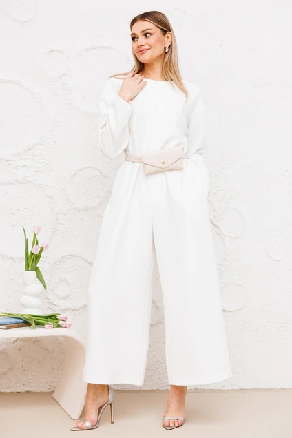 Комбинезон свободного силуэта со спущенным плечом и застежкой на потайную тесьму молнию с переди.Вырез горловины круглый. Рукав втачной длинный.В боковых швах действующие карманы.Пояс из основной ткани и ремень-сумка в комплекте.