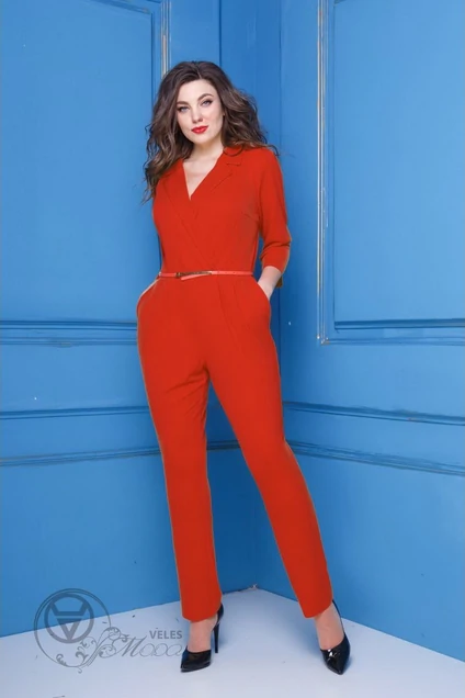 Комбинезон женский из трикотажного полотна, красного цвета, с запахом по линии талии . Комбинезон отрезной по линии талии, заужен к низу. Длина комбинезона до косточки. По лифу комбинезона -талиевые и нагрудные вытачки. По низу переда- боковые карманы, по линии талии-мягкие складки( 4шт.). По спинке по верхней и нижней части -талиевые вытачки и средний шов с молнией. В горловине комбинезона воротник "английского" типа с запахом по линии талии. Рукав втачной, одношовный, 3/4 длины. Прилагается съемный готовый пояс. Длина комбинезона -(44-48)- 140см.длина спинки-40см.,длина брюк-100см.длина рукава-47см.;длина комбинезона-(50,52)- 141см.длина спинки-41см.,длина брюк-100см.,длина рукава - 49 см.
