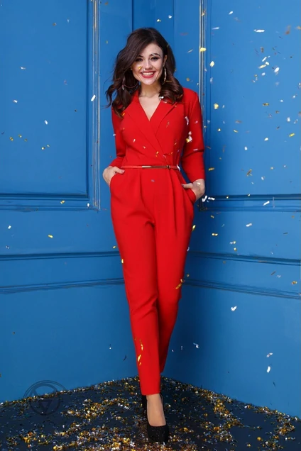 Комбинезон женский из текстильной ткани, красного цвета, с запахом по линии талии . Комбинезон отрезной по линии талии, заужен к низу. Длина комбинезона до косточки. По лифу комбинезона -талиевые и нагрудные вытачки. По низу переда- боковые карманы, по линии талии-мягкие складки( 4шт.). По спинке по верхней и нижней части -талиевые вытачки и средний шов с молнией. В горловине комбинезона воротник "английского" типа с запахом по линии талии. Рукав втачной, одношовный, 3/4 длины. Прилагается съемный готовый пояс. Длина комбинезона - 143 см. Длина рукава - 47 см.