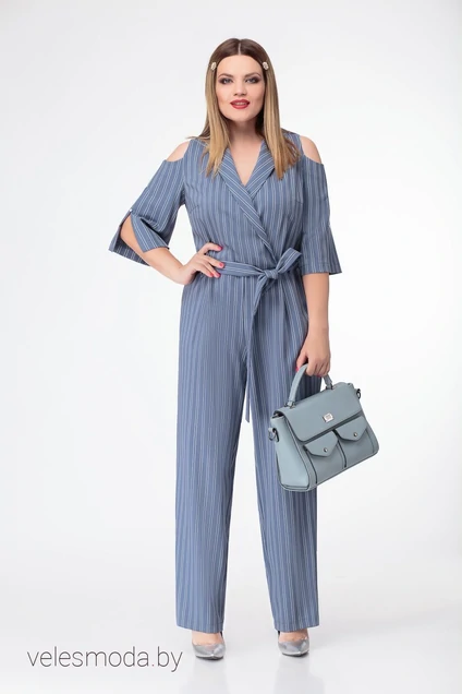 Комбинезон женский выполнен из ткани в полоску. Верхняя часть комбинезона - лиф по полочке с запахом на левую сторону и цельнокроеным отложным воротником типа "шаль", нагрудными вытачками, выходящими от боковых швов. По шву притачиваяния и нижней части заложены защипы-складки. Спинка со средним швом с потайной молнией, воротник по центру спинки разрезной, спинка с талиевыми вытачками. Рукав втачной, двухшовный, длиной 3/4, в верхней части оката плечо открыто, по верхнему шву рукава выполнен разрез. Нижняя часть комбинезона брюки, свободные в бедрах и чуть заужены к низу. По передним половинам обработаны карманы и по линии талии защипы-складки. Задняя часть брюк с талиевыми вытачками. По линии талии настрочены шлевки, через которые продет пояс завязывающийся спереди.