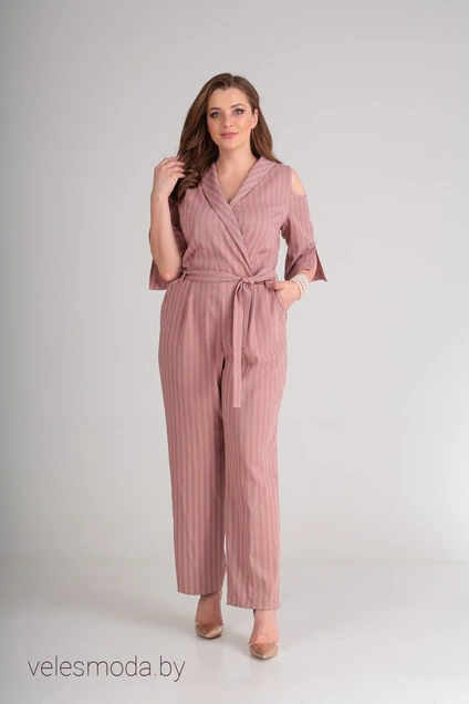 Комбинезон женский выполнен из ткани в полоску. Верхняя часть комбинезона - лиф по полочке с запахом на левую сторону и цельнокроеным отложным воротником типа "шаль", нагрудными вытачками, выходящими от боковых швов. По шву притачиваяния и нижней части заложены защипы-складки. Спинка со средним швом с потайной молнией, воротник по центру спинки разрезной, спинка с талиевыми вытачками. Рукав втачной, двухшовный, длиной 3/4, в верхней части оката плечо открыто, по верхнему шву рукава выполнен разрез. Нижняя часть комбинезона брюки, свободные в бедрах и чуть заужены к низу. По передним половинам обработаны карманы и по линии талии защипы-складки. Задняя часть брюк с талиевыми вытачками. По линии талии настрочены шлевки, через которые продет пояс завязывающийся спереди.