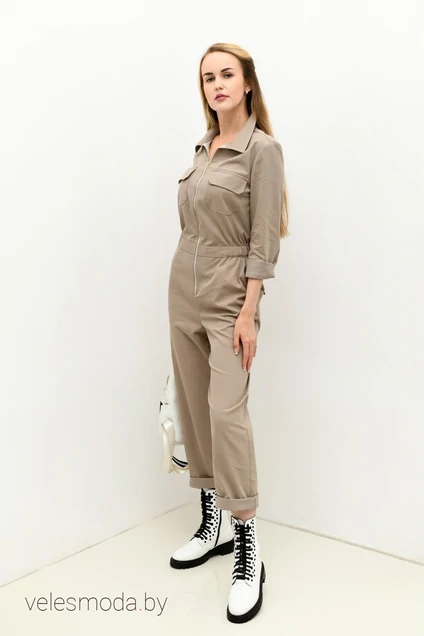 Женский комбинезон свободного силуэта, отрезной по линии талии, со спущенным длинным рукавом на манжете, рубашечным воротником на стойке и застежкой по переду на молнию. В настрочную кулиску на талии вставлена резинка. Брюки комбинезона свободные, прямые, с боковыми карманами "хулиган". Комбинезон выполнен из плотного хлопкового полотна.